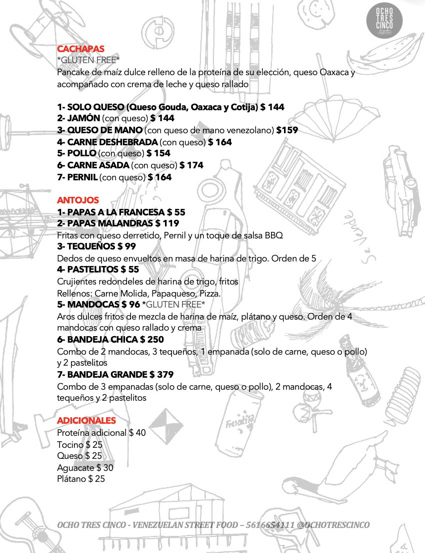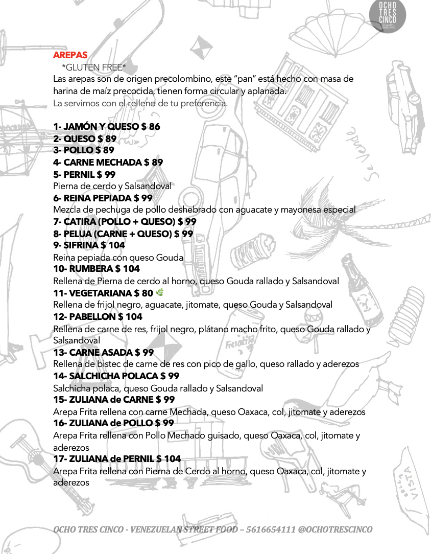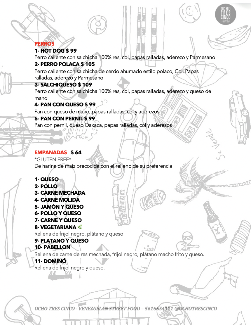 Welcome to Ocho Tres Cinco, a lively gem nestled in the heart of Cuauhtémoc, Mexico City. This vibrant eatery is renowned for its authentic Venezuelan street food, captivating locals and visitors alike with its delightful offerings. The menu features standout items like the Pollo Patacon, where crispy fried plantains replace traditional bread, creating a unique and satisfying sandwich experience. Reviews highlight its fresh flavors and texture, with a complex blend of creamy, tart, and savory notes.